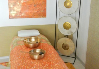 Die Klangschalen werden auf den bekleideten oder unbekleideten Körper aufgesetzt und angeschlagen.